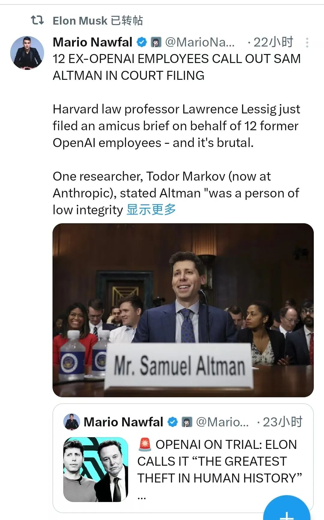 马斯克往事重提,质问奥特曼“偷走了一个非牟利组织”,指OpenAI原口角牟利机构,在奥特曼的引导下转向牟利模式。